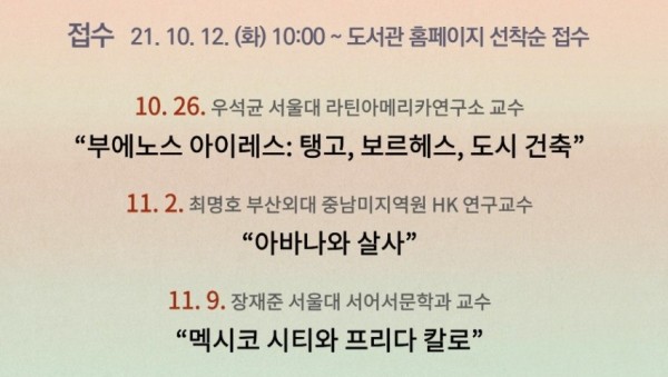 용인시 도서관사업소가 시민들을 위한 온라인 강연‘용인시민과 함께 하는 라틴아메리카 문화 기행: 도시와 예술’을 준비했다. 오는 26일부터 다음 달 16일까지 화상회의 앱인 줌(ZOOM)으로 진행되는 이번 강연은 한국외국어대학교 중남미연구소 인문 한국 플러스 사업단 및 경희대학교 중남미연구소와 협업해 마련했다. 강연은 우석균 서울대학교 라틴아메리카 연구소 HK 교수의 ‘부에노스 아이레스: 탱고…