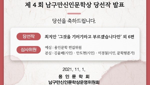 ‘제4회 남구만 신인문학상’에 최지안 씨의 ‘그것을 기러기라고 부르겠습니다만’ 외 6편이 선정됐다. 용인문학회(회장 이원오)가 주최하고 용인시와 용인 신문사, 의령남씨 문충공파 종중이 후원하는 ‘남구만 신인문학상’은 조선시대 문신 ‘약천 남구만(1629~1711)’의 문학세계를 기리고 시 창작을 장려하기 위해 지난 2018년 제정됐다. 올해 공모는 지난달 진행됐으며, 예심과 본…