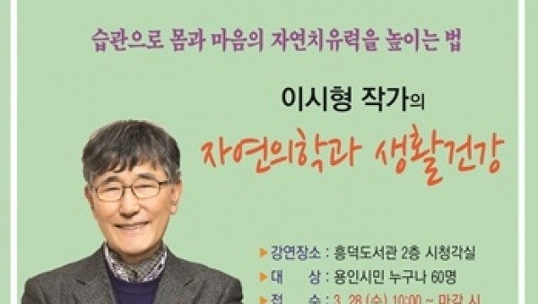 용인시는 유명 저자를 초청해 강연을 듣는 ‘북타임’의 강좌로 다음달 11일 흥덕도서관에서‘면역이 암을 이긴다’의 저자인 이시형 박사의 강연을 개최한다고 밝혔다. 행복호르몬 ‘세로토닌’전도사로 잘 알려진 이 박사는 이번 강연에서 ‘자연의학과 생활건강’을 주제로 식습관, 생활습관, 마음습관을 개선해 몸과 마음의 치유력과 면역력을 스스로 높이는…