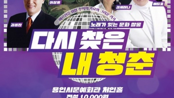 다시찾은내청춘 포스터(완)_0404다시찾은내청춘 포스터(완)_0404(재)용인문화재단(이사장 정찬민)은 2017년 리모델링 공사를 마치고 새롭게 단장한 용인시문예회관 처인홀에서 어르신과 청소년을 위한 다양한 기획 공연을 마련했다. ▲ 다시찾은 내청춘 포스터 재단에서 기획한 공연은 ‘웰컴 투 처인홀 시리즈’ 공연으로 먼저 ‘시리즈 Ⅰ’은 ‘다시 찾은 …