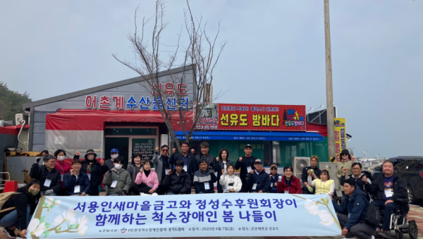 정양호 서용인새마을금고 이사(뒤 왼쪽 다섯 번째), 정성수 후원회장 ㈜골드브릿지 대표(뒤 왼쪽 여섯 번째) 천영달 후원위원 ㈜대성글로비즈 대표(뒤 왼쪽 일곱 번째), 이주연 봉사단장(뒤 왼쪽 여덟 번째) 서용인새마을금고(임민…