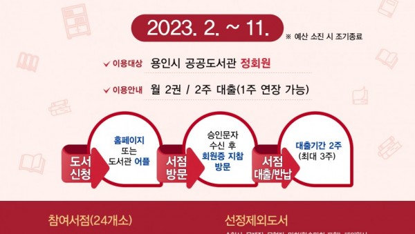 용인특례시(시장 이상일)가 이달부터 2023년 희망도서 바로대출제를 시작한다. 가까운 서점에서 읽고 싶은 새 책을 빌려보는 이 제도는 지난 2015년 용인시가 전국에서 처음 시작했다. 시민들은 깨끗한 새 책을 부담 없이 빌려볼 수 있고 지역 서점은 경기침…