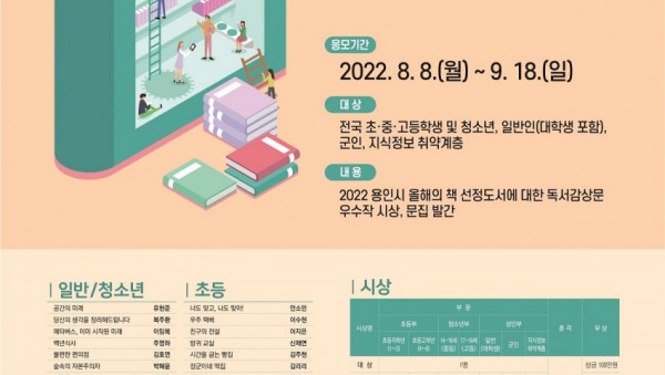 용인시가 오는 8일부터 다음 달 18일까지 ‘2022 용인시 전국 독서감상문대회 「처인성」’ 참가자를 모집한다고 5일 밝혔다. 용인시민은 물론 전 국민이 참여할 수 있으며 ▲초등부(저학년·고학년) ▲청소년부(중등·고등) ▲성인부(일반·군인·지식정보 …