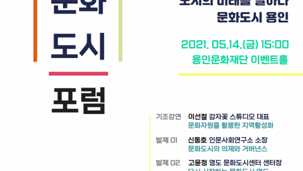 (재)용인문화재단(이사장 백군기)은 오는 14일 용인문화재단 이벤트홀에서 외부 문화도시 전문가와 지역 내 문화관련 전문가 및 시민들이 참여 가능한 1차 문화도시포럼을 연다고 밝혔다. 이선철 감자꽃스튜디오 대표의 ‘문화자원을 활용한 지역활성화’ 주…