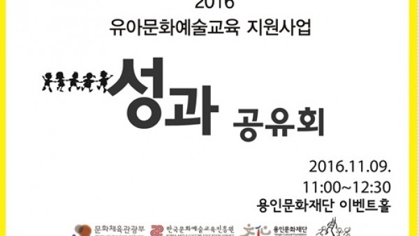 (재)용인문화재단(이사장 정찬민)은 문화체육관광부에서 주최하고 한국문화예술교육진흥원에서 주관하는 ‘2016 유아 문화예술교육 지원사업’의 성과공유회를 11월 9일 오전 11시 용인문화재단 이벤트홀에서 진행한다. 재…