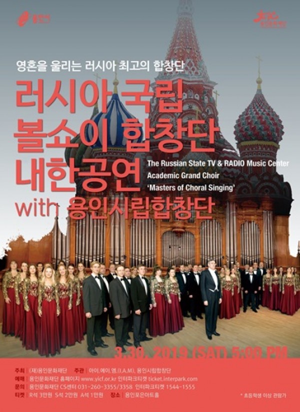 (재)용인문화재단(이사장 백군기)은 91년의 오랜 전통을 가진 러시아 국립 볼쇼이 합창단의 내한공연을 오는 3월 30일(토) 오후 5시 용인포은아트홀에서 개최한다. ▲ 러시아 국립 볼쇼이 합창단 내한공연 포스터이미지 1928년 러시아 합창음악의 거장 알렉산드르 스베슈니코프에 의해 창단된 러시아 국립 볼쇼이 합창단은 러시아 민요와 고전음악을 대중들에게 …