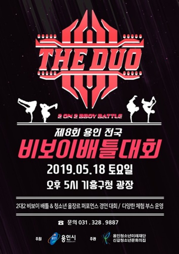 신갈청소년문화의집 청소년축제인 비보이 배틀대회‘THE DUO’가 오는 5월 18일(토요일) 오후 5시에 기흥구청 야외무대에서 진행된다. 2012년 1회 대회를 시작으로 올해 제8회 대회로 접어들었다. 이번에는 청소년과 기흥구주민들이 춤을 통하여 서로 소통하고 호흡하는 문화의 장을 만들기 위해 기흥구청 야외무대로 자리를 옮겼다. …