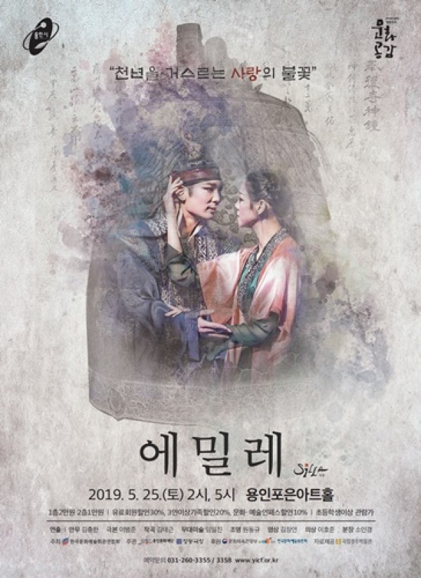 (재)용인문화재단(이사장 백군기)은 오는 5월 25일 토요일 2시, 5시 총 2회에 걸쳐 뮤지컬 <에밀레>를 용인포은아트홀에 올린다. ▲ 에밀레-포스터이미지 천년왕조 신라시대의 역사 콘텐츠를 각색하여 두 남녀의 애절한 사랑과 희생의 번민을 화려하게 예술적으로 표현한 <에밀레>는 천년의 역사와 찬란한 문화를 춤과 음악으로 형상화하여 신…