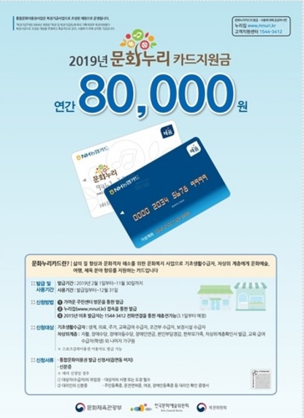 용인시가 저소득층의 문화생활을 돕기위해 발급하는 문화누리카드 신청을 주민센터 및 온라인으로 접수한다. 대상은 기초생활수급자와 차상위계층(만6세 이상) 등 문화소외계층이다. 대상자는 가까운 읍면동 주민센터를 방문하거나 문화누리카드 홈페이지(www.mnuri.kr)로 11월 30일까지 신청하면 된다. 이 카드는 영화·전시·공연·스포…