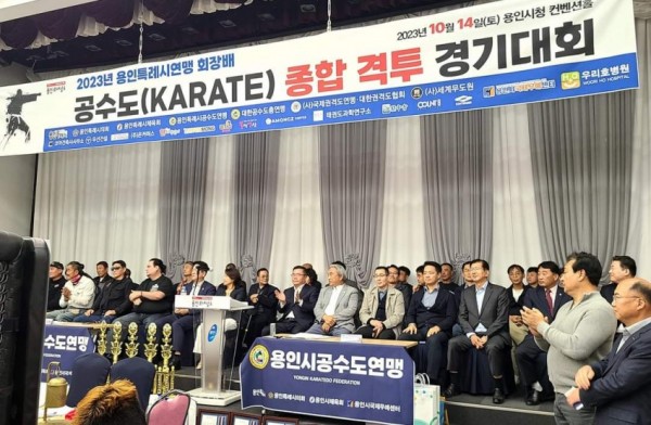 지난 14일(토) 용인시청 컨벤션홀에서는 2023년도 용인시연맹회장배 공수도(가라데) 종합격투 경기대회가 22개팀 300여명이 참가하여 성황리에 개최되었다. 이번 대회는 공수도 올림픽룰인 형(KATA), 대련(KUMITE) 경기를 비롯하여 공수도 실전경기 룰인 KARATECOMBAT, 입식타격(K-1룰) 및 종합격투(MMA)룰이 추가되어 진행되었다. 대회식1  …