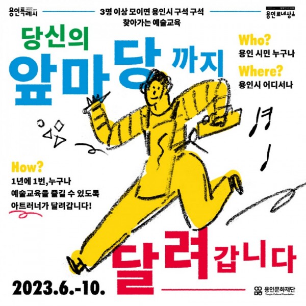 1. 당신의 앞마당까지 달려갑니다 - 포스터 용인문화재단(이사장 이상일)은 6월부터 10월까지 찾아가는 예술교육 사업 를 진행한다. 는 용인 시민 3명 이상만 모이면 예술교육 매개자인 ‘아트러너’가 찾아가 예술교육 프로그램을 진행하는 용인문화재단의 대표적인 사업이다. 물리적인 거리가 멀어서, 어린 자녀를 키우느라 바빠서, 또는 시간 맞추기가 어려워서 등 다양한 이유로…