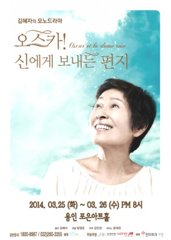 - 프랑스 베스트셀러 에릭 엠마뉴엘 슈미트의 <신에게 보내는 편지> 원작 용인포은아트홀에서는 오는 3월 25일(화)~26일(수) 오후 8시, 2회에 걸쳐 배우 김혜자의 모노드라마 <오스카! 신에게 보내는 편지>가 공연된다. 이번 작품은 ‘국민 엄마’로 불리며 브라운관과 스크린을 종횡무진하는 배우 김혜자를 오…