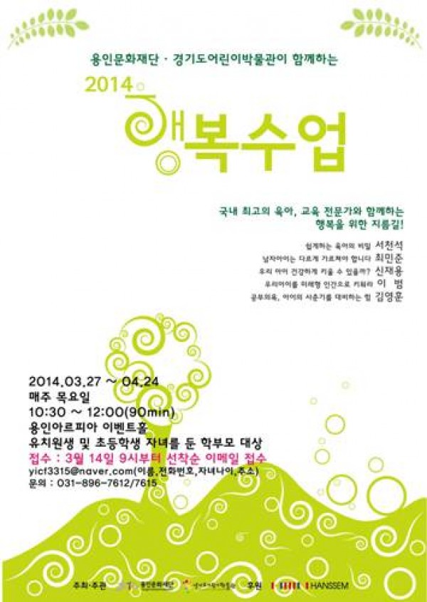 용인문화재단(대표이사 김혁수)은 오는 3월 27일부터 5주간 유치원‧초등학생 자녀를 둔 부모를 대상으로 육아 및 자녀교육에 대한 전문가 초청 릴레이 강연을 개최한다. 용인문화재단과 경기문화재단, 경기도어린이박물관이 공동 주최하는 부모교육 <2014 행복수업>은 작년에 이어 두 번째로 선보이는 프로그램으로 자녀교육과 관련된 국내 유…