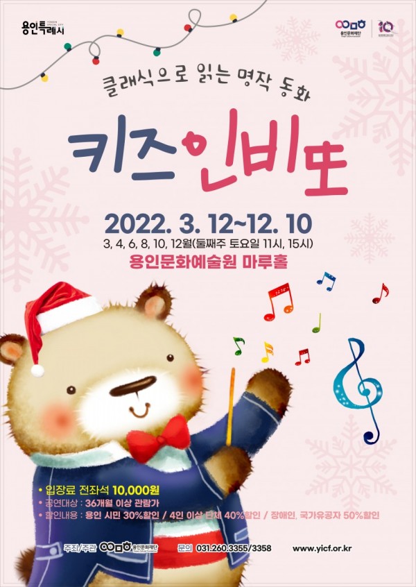 사진 설명 : 홍보 포스터 용인문화재단(이사장 이상일)은 ‘키즈 인비또’ 12월 공연의 티켓을 오는 10일 오후 2시에 오픈한다고 밝혔다. 오랜 시간 사랑받은 세계 명작 동화를 클래식 앙상블 연주와 함께 감상하는 교육과 즐거움을 아우르는 공연인 ‘키즈 인비또’는 풍부한 감정 표현과 섬세한 연주로 깊은 감동을 선사하는 엘 콰르텟(L quartet)의 연주와 함께 명쾌한 키즈 음악 해설로…