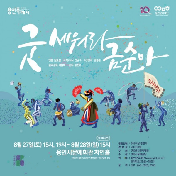 사진 설명 : 굿 세워라 금순아 포스터 및 공연 사진 (재)용인문화재단(이사장 이상일)은 서울예술단의 창작뮤지컬 를 오는 8월 27일부터 28일까지 용인시문예회관 처인홀에서 개최한다. 는 민속 신앙인 ‘굿’을 소재로 전통 마당놀이 형식에 사물놀이와 가무를 결합하여 구성한 창작가무악극이다. 우리에게 익숙한 신명나는 장단, 흥겨운 춤과 함께 펼쳐지는 소동극은 온 가족이…