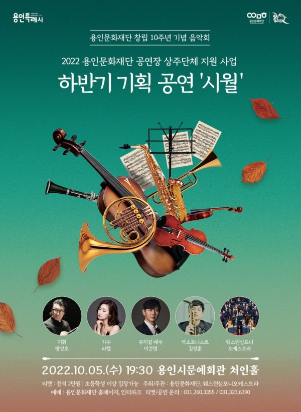 사진설명 : 2022 공연장 상주단체 지원 사업 기획공연 포스터 용인문화재단(이사장 이상일)은 오는 10월 5일 오후 7시 30분, 용인시문예회관 처인홀에서 공연장 상주단체 지원 사업 수행 단체 웨스턴심포니오케스트라와 함께 기획 공연 을 진행한다. 웨스턴심포니오케스트라는 2022년 공연장 상주단체 지원 사업의 수행 단체로 선정되어 올 한해 용인문화재단과 함께 다채로운 공연을 선사하고 …