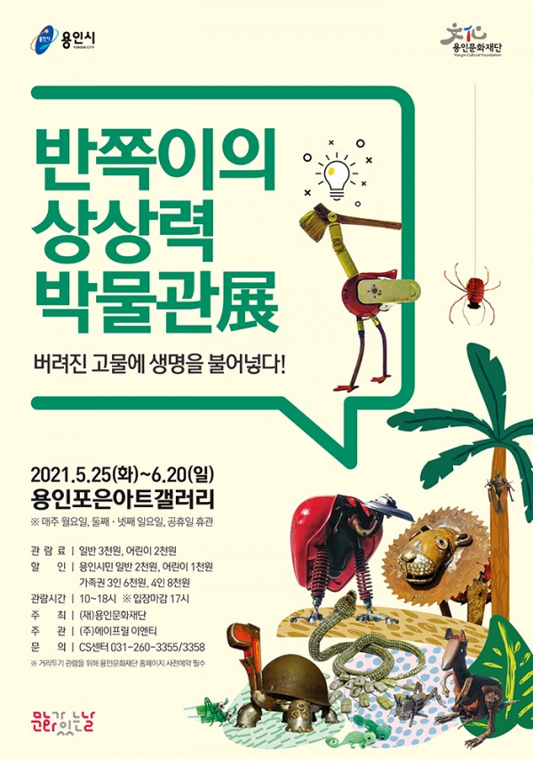 (재)용인문화재단(이사장 백군기)은 오는 20일(일)까지 을 용인포은아트갤러리에서 진행한다. 은 고물에 생명을 불어넣은 정크아트 작품 전시로 어린이와 가족 단위 관람객들에게 환경의 소중함을 느끼고, 사물을 보는 새로운 인식을 가져볼 기회를 제공한다. 시사 만화가로 오랫동안 활동한 반쪽이 최정현 작가는 고물과 재활용품 및 자연물을 이용해 작품을 만들어 전시회를 꾸준히 열고 있다. 성황리에…
