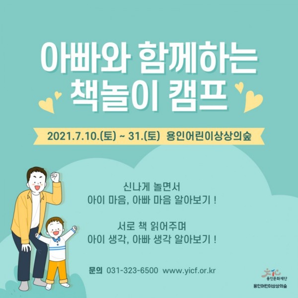 (재)용인문화재단(이사장 백군기)이 운영하는 ‘용인어린이상상의숲(이하 상상의숲)’열린도서관에서는 7월10일부터 30일까지 매주 토요일 아이와 함께 시간을 보내고 싶은데 어떻게 해야 할지 고민인 아빠, 아빠와 함께 신나게 놀고 싶은 아이들을 위한 를 개최한다. 는 아빠와 아이가 책과 다양한 놀이를 통해 공감대를 형성할 수 있도록 신나게 놀면서 아이마음·아빠마음 알아보기, 서로 책 읽어주며…