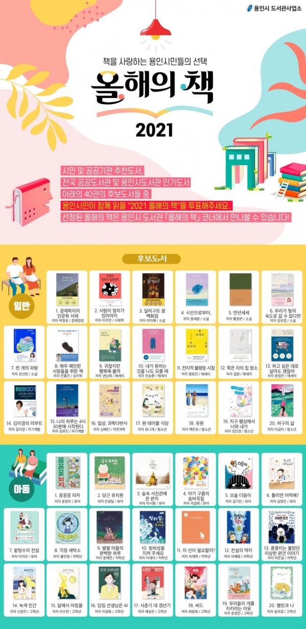 용인시 도서관이 29일부터 시민 설문조사를 통해 ‘2021년 용인시 올해의 책’을 선정한다. 시는 지난 2009년부터 책으로 소통하고 공감하는 ‘책의 도시 용인’을 조성하기 위해 범시민 독서 운동의 일환으로 올해의 책을 매년 선정해 왔다. 올해 설문조사는 다음달 18일까지 시 도서관 홈페이지와 관내 13개 도서관 자료실 투표 보드에서 참여할 수 있으며, 후보 도서 40권 중 선택하면 된다.…