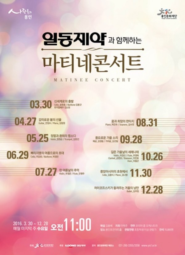 (재)용인문화재단(이사장 정찬민)은 오전에 만끽하는 클래식 선물 ‘일동제약과 함께 하는 마티네 콘서트’의 4월 공연을 4월 27일 오전 11시 ‘감미로운 봄의 선율’란 테마로 선보인다. 세련되고 품격 있는 해설로 관객들의 사랑을 받고 있는 ‘11시 콘서트’의 창시자 김용배의 해설과 탁월한 음악적 해석의 지휘자 이택주의 …