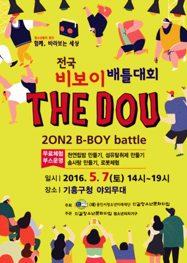 용인시청소년미래재단 신갈청소년문화의집에서는‘2016 비보이 배틀대회’를 5월 7일(토) 14시~19시까지 기흥구청 야외무대에서 개최한다. 이번 대회는 2 ON 2 비보이 배틀대회로 청소년 2명으로 구성된 비보이 50팀을 선착순 모집 중이다. 참가비는 무료이며, 접수 방법 이메일(duo2012@naver.com) 혹은 전화(031-328-9887)로 팀명…
