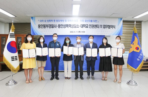 용인동부경찰서(서장 유제열)는 22.8.11.(목)14:00,용인동부경찰서-용인성폭력상담소-대학교인권센터*와 대학 內 여성폭력(성폭력,데이트폭력,스토킹) 범죄예방을 위한 업무협약을 체결했다고 밝혔다. * 6개 대학:강남대,루터대,명지대,용인대,용인예술과학대학,한국외대 이날 협약식은 최근 대학교 內 여성폭력(성폭력,데이트폭력,스토킹) …