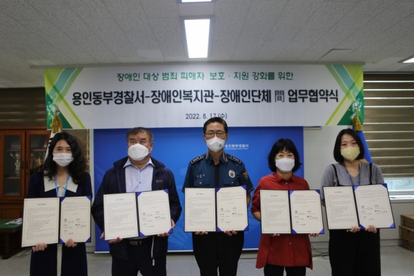 용인동부경찰서(서장 유제열)는 22.8.17.(수)14:00,용인동부경찰서-용인시장애인복지관(처인·기흥)-장애인단체*와 장애인 대상 범죄 피해자 보호 및 장애인 위기가정 지원을 위한 업무협약을 체결했다고 밝혔다. * 장애인단체:경기도 시각장애인연합회 용인시지회, 용인시 수어통역센터 이날 협약식은 사회적 약자인 장애인에 대한 범…