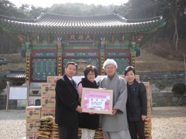 용인시 처인구 이동면 어비리에 소재한 ‘동도사’ (주지 도원혜성)에서는 19일 이동면사무소에 쌀 100포(4kg), 라면 58박스 등 220여만원 상당의 성품을 기탁했다. ‘동도사’는 1993년부터 불우이웃돕기를 시작한 이래 지금까지 매년 불우이웃돕기 성품을 기탁하고 있는 종교단체이다. 2000년부터는 매년 청소년 돕기 일일찻집을 운영하여 그때 모…