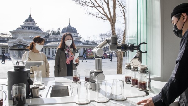 에버랜드에 오픈한 로봇 카페 '라운지엑스' 국내 최대 테마파크 에버랜드에 로봇 협업 카페 '라운지엑스'가 7일 오픈했다. 라운지엑스에서는 바리스타 로봇이 드립 커피를 내려 주고, 로봇이 아이스크림을 만들어 주는 등 색다른 로봇 서비스를 제공한다. 특히 에버랜드 라운지엑스에서는 백호랑이 블렌드, 다람쥐 땅콩 플렛 등 동물을 모티브로 기획된 음료 메뉴와 에버랜드 한정판 MD 상품…