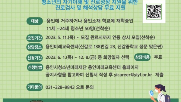 용인시청소년미래재단(이사장 이상일) 용인미래교육센터는 2023년도 청소년 개인진로상담 (사업명 : 개인진로상담 디어마이드림) 참가자를 모집한다고 밝혔다. 청소년의 자기이해 및 진로성장 지원을 위한 진로검사 및 해석상담을 무료 지원하고 있다. 상담 장소는 용인미래교육센터(신갈로138번길23)이며 총 2회기로 진행된다. 1회는 진로탐색검사, 다중지능검사, 강…