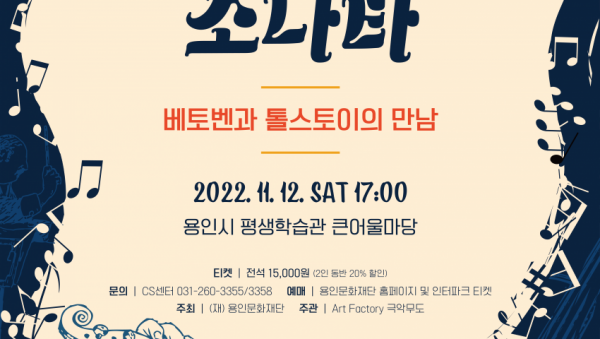 사진 : 낭독콘서트 포스터 (재)용인문화재단(이사장 이상일)은 낭독콘서트 ‘크로이체르 소나타-베토벤과 톨스토이의 만남’을 오는 11월 12일 오후 5시 용인시평생학습관 큰어울마당에서 선보인다. 이번 공연은 베토벤의 ‘크로이체르 소나타’를 듣고 영감을 받은 톨스토이가 결혼과 사랑, 남녀 간의 만남과 이별에 대한 이야기로 이루어진 소설을 기반으로 만들어졌다. …