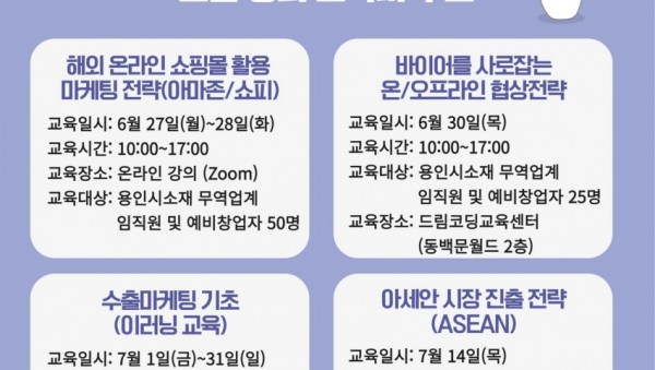 용인시산업진흥원(원장 김윤석, 이하 진흥원)이 관내 중소기업의 해외 진출 역량을 강화하기 위한 길잡이 역할에 나섰다. 진흥원은 관내 수출 중소기업의 임직원 및 예비창업자를 대상으로 ‘2022년 수출역량 강화교육’을 진행한다고 22일 밝혔다. 이번 교육과정은 오는 6월 27일 시작되는 ‘해외 온라인 쇼핑몰 활용 마케팅 전략 과정’의 온라인 교육을 시작으로, 10월 말…