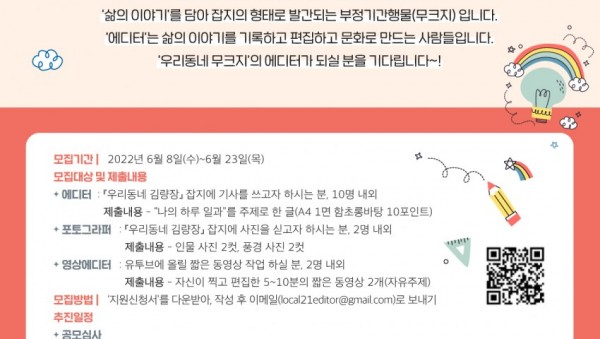 느티나무재단은 6월 23일까지 ‘우리동네 에디터 양성교육’을 위해 참여할 시민들을 모집한다. ‘우리동네 에디터’는 올해 11월에 발간될 잡지 『우리동네 김량장』에 기자로 참여하여 글쓰기 특강과 현장실천학습을 통해 ‘로컬 에디터’로 성장해 나가도록 하는 교육프로그램에 참여할 수 있다. 신청은 포스터 속 QR코드로 접속하여 ‘지원신청서’를 다운받아 작성 후, …