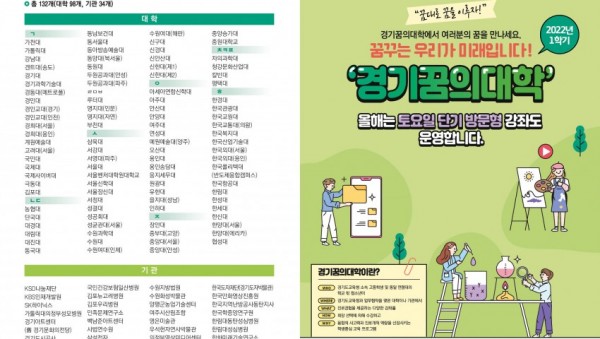◦ 경기꿈의대학 1학기, 4월 11일부터 6월 22일까지 8주간 운영◦ 132개 기관에 청소년 2만 2백여 명 수강◦ 방문형 408개, 거점형 405개, 온라인형 288개 등 총 1,101개 강좌 개설 경기도교육청(교육감 이재정)이 11일부터 6월 22일까지 경기꿈의대학 1학기 강의를 운영한다.1학기 강의는 98개 대학과 34개 참여기관에서 청소년 2만 2백여 명을 대상으로 …