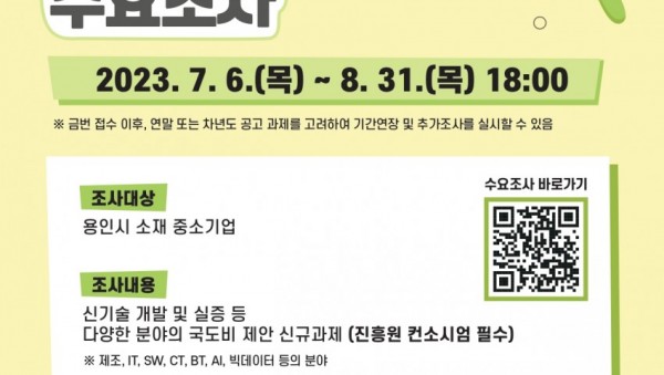 용인시산업진흥원(이사장 이상일, 이하 진흥원)은 관내 중소기업의 발굴․육성 및 2024년 국도비 사업 추진을 위해 IT/SW, 제조 등 다양한 산업분야의 과제발굴 수요조사를 실시한다고 밝혔다. 이번 수요조사는 다음달 8월 …