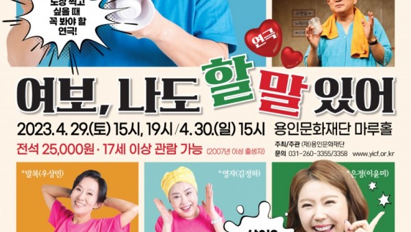 사진 설명 : ‘여보, 나도 할 말 있어’ 포스터 용인문화재단(이사장 이상일)은 마루홀 기획공연 시리즈로 준비한 연극 ‘여보, 나도 할 말 있어’를 오는 4월 29일, 30일 이틀에 걸쳐 용인문화예술원 마루홀에서 선보인다. 연극 ‘여보…