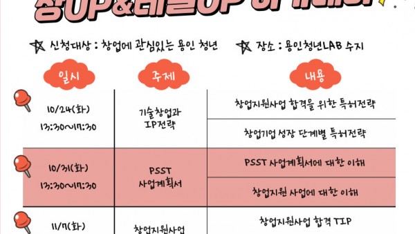 용인특례시(시장 이상일)가 오는 24일부터 다음 달 21일까지 ‘용인청년랩(LAB) 창업(UP) & 레벨업(UP) 아카데미 2기’를 운영한다고 6일 밝혔다. 이번 창업아카데미는 ‘기술창업과 IP전략’, ‘PSST 사업계획서’, ‘창업지원사업 합격전략’,…