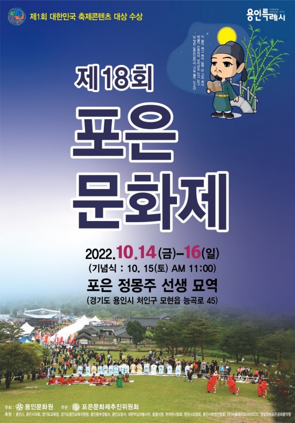 포은 정몽주 선생의 충절과 학덕을 기리는 제18회 포은문화제가 10월 14일(금)부터 16일(일)까지 경기도 용인시 처인구 모현읍 능곡로 45 포은 정몽주 선생 묘역에서 열린다. 고려시대 충신이며 동방이학의 시조로서 조선 성리학의 기반을 마련한 포은 정몽주 선생의 지고한 정신문화를 계승하기 위해 매년 개최되는 포은문화제는 제1회 대한민국축제콘텐츠 대상을 받은 전통문화축제이다. …