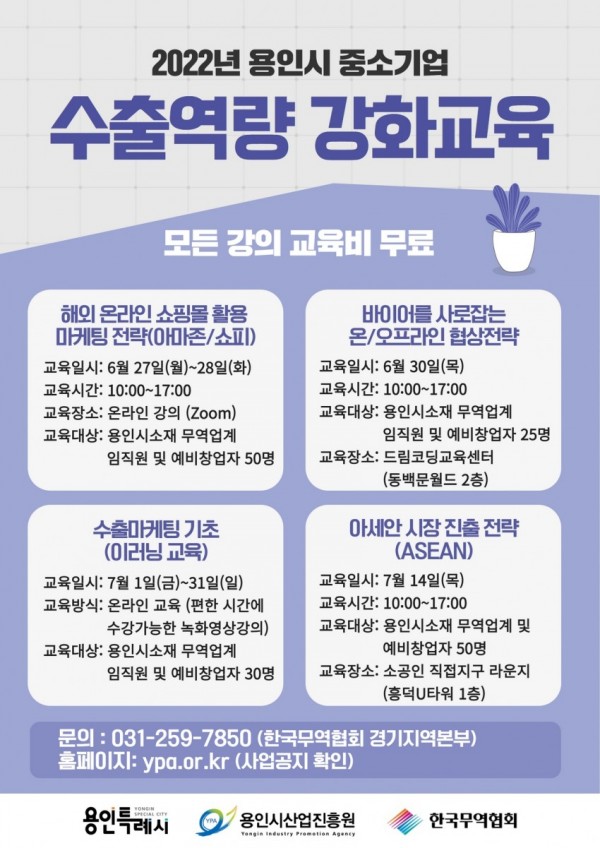 용인시산업진흥원(원장 김윤석, 이하 진흥원)이 관내 중소기업의 해외 진출 역량을 강화하기 위한 길잡이 역할에 나섰다. 진흥원은 관내 수출 중소기업의 임직원 및 예비창업자를 대상으로 ‘2022년 수출역량 강화교육’을 진행한다고 22일 밝혔다. 이번 교육과정은 오는 6월 27일 시작되는 ‘해외 온라인 쇼핑몰 활용 마케팅 전략 과정’의 온라인 교육을 시작으로, 10월 말…