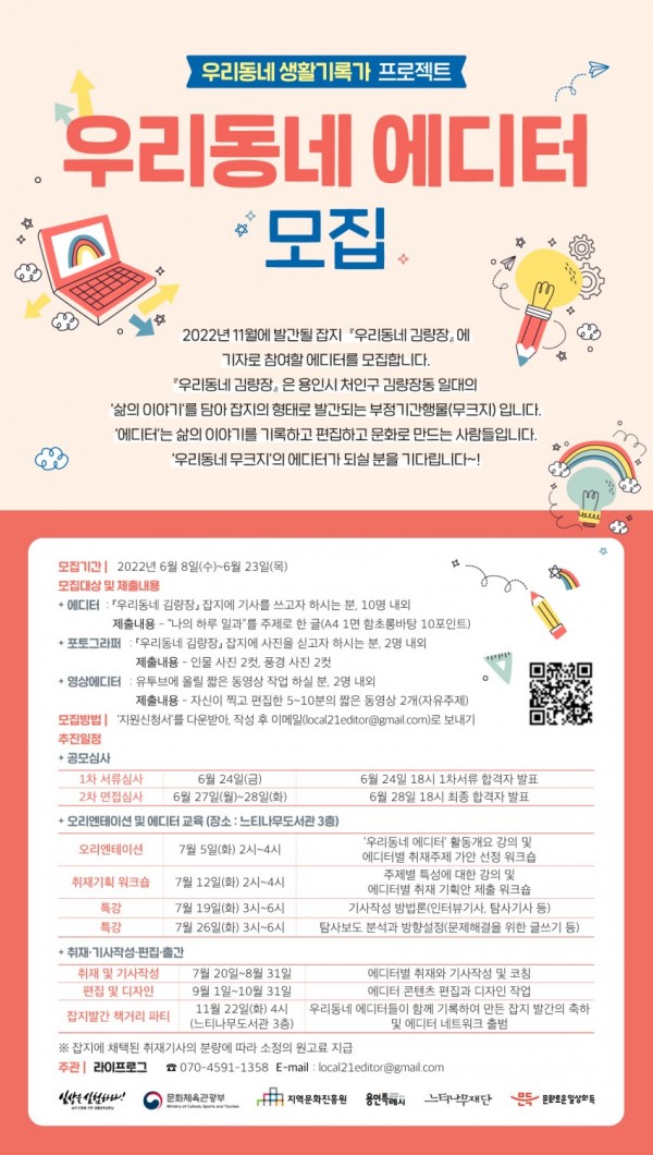 느티나무재단은 6월 23일까지 ‘우리동네 에디터 양성교육’을 위해 참여할 시민들을 모집한다. ‘우리동네 에디터’는 올해 11월에 발간될 잡지 『우리동네 김량장』에 기자로 참여하여 글쓰기 특강과 현장실천학습을 통해 ‘로컬 에디터’로 성장해 나가도록 하는 교육프로그램에 참여할 수 있다. 신청은 포스터 속 QR코드로 접속하여 ‘지원신청서’를 다운받아 작성 후, …