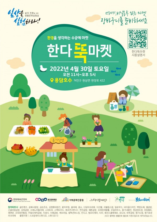 환경보호와 기후위기 극복을 위한 수공예 장터, ‘한다뚝마켓’이 4월 30일(토) 용인시 처인구 원삼면 용담호수에서 열린다. 용인의 생활문화 협동조합 ‘문화와함께’와 환경운동 실천단체 ‘한다’가 콜라보로 마련한 ‘한다뚝마켓’은 나무와 금속, 천, 염색 등 다양한 분야의 수공예 작가 40여명이 참여해 직접 만든 친환경 제품을 전시 판매하고, 쓰레기 없는 제로웨이스트 장터를 선보인…