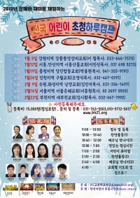2019년 여름 어린이 예수사랑 캠프 장소: 용인파인리조트 주제: 거룩이 파워다 1차. 7.24(수)-26(금)/ 2박3일 2차. 7.26(금)-27일(토)/ 1박2일 3차. 7.29(월)-31(수)/ 2박3일 4차. 7.31(수)-8.2(금)/ 2박3일 5차. 8.2(금)-3토)/ 1박2일 포스터 제작 되면 바로 올립니다