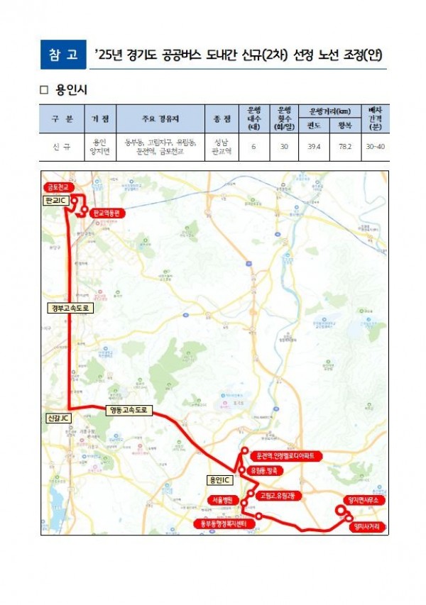 경기도의회 건설교통위원회 김영민 의원(국민의힘, 용인2)은 23일 경기도가 추진 중인 ‘2025년도 광역 공공버스 도내간 신규노선 신설’과 관련된 용인시(양지면-판교역) 신규노선 신설 추진상황을 업무보고 받고 노선확정 및 운행개시까지 후속절차를 점검했다. 이번 2025년도 광역 공공버스 도내간 신규노선 신설은 출퇴근 시간대 광역 이동 기능 강화에 초점을 맞추어 추진되었다. 특히, 양지면-판교역 노선의 경우 도내 주요 생활권과 고용거점을 보다 촘촘히 연결하고 통행시간 단축과 정시성 개선을 통해 도민의 체감 이동 편의를 높이기 위…