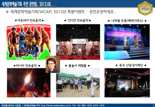 문화를 만드는 사람들 / 세계문화예술기획(http://www.makeshow.co.kr/)대표 왕지민입니다. 011-9131-1070공지사항입니다(10년만에 처음으로 공연팀 출연료 조정합니다)나라별로, 장르별로 많은종류의 공연단이 준비되어 있습니다.여기저기 소문좀 내주세용 ^^외국인공연단 세계문화예술기획입니다.(공연신청하세요)국내, 해외 공연단을 장르별로 보유하고 있습니다.국내, 해외 전문 모델과 배우가 준비되어 있습니다.외국…