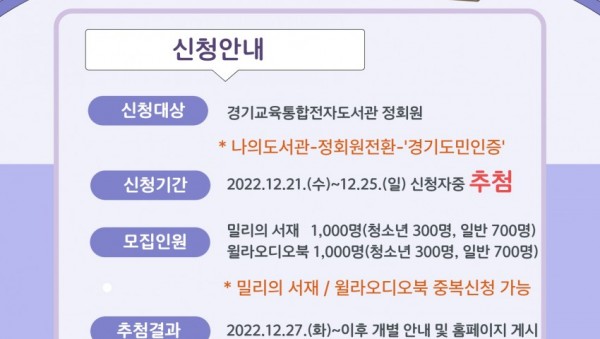 ◦ 신청자 중 추첨을 통해 청소년 300명, 일반 700명 구독권 제공 ◦ ‘밀리의 서재’와 ‘윌라오디오북’ 3개월 구독권 제공 경기중앙교육도서관_21부터_통합전자자료_구독서비스_신청_안내문 경기중앙교육도서관(관장 신…