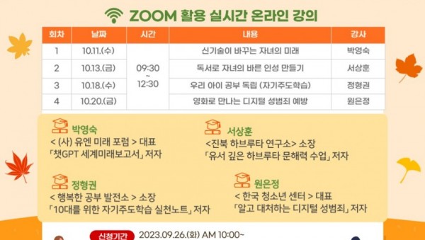 ◦ 9월 5일부터 11월 29일까지 도서관 및 온라인(ZOOM) 진행 프로그램 ◦ AI(인공지능) 영상 제작 과정, 책 놀이 지도사 자격증 과정 등 구성 ◦ 학생 미래 역량 강화, 지역기관 연계 지식정보 취약계층 성장 기대 &…