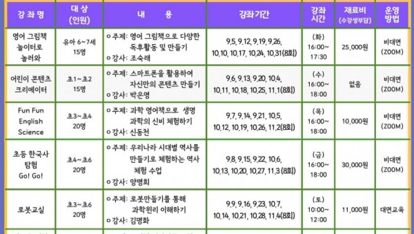 ◦ 1차 8월 21일, 2차 10월 16일부터 누리집에서 수강생 선착순 접수◦ 유아·학생(각 4회, 10개 강좌), 학부모(각 4회, 2개 강좌) 대상 진행◦ 그림책 놀이 즐거움, 과학실험 놀이터, 독서토론 등 총 12개 강좌 경기과천교육도서관(관장 구명서…