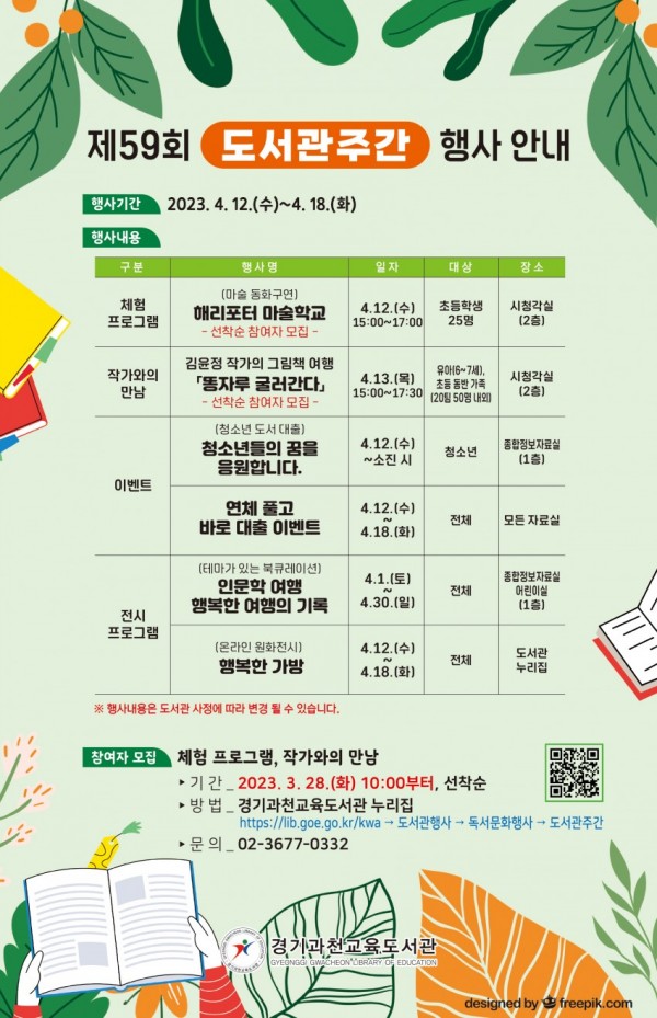 ◦ 4월 12일~ 18일, 다양한 체험프로그램과 이벤트 실시 ◦ 마술 동화구연, 작가의 그림책 여행, 이벤트, 전시 등 ◦ 28일부터 과천교육도서관 누리집에서 참여자 선착순 모집 경기과천교육도서관, 도서관 주간 맞아 다양한 독서문화 행사 운영(포스터) 경기과천교육도서관(관장 구명서)이 제59회 도서관주간과 제1회 도서관의 날을 맞아 다양한 독서문화 행사를 …