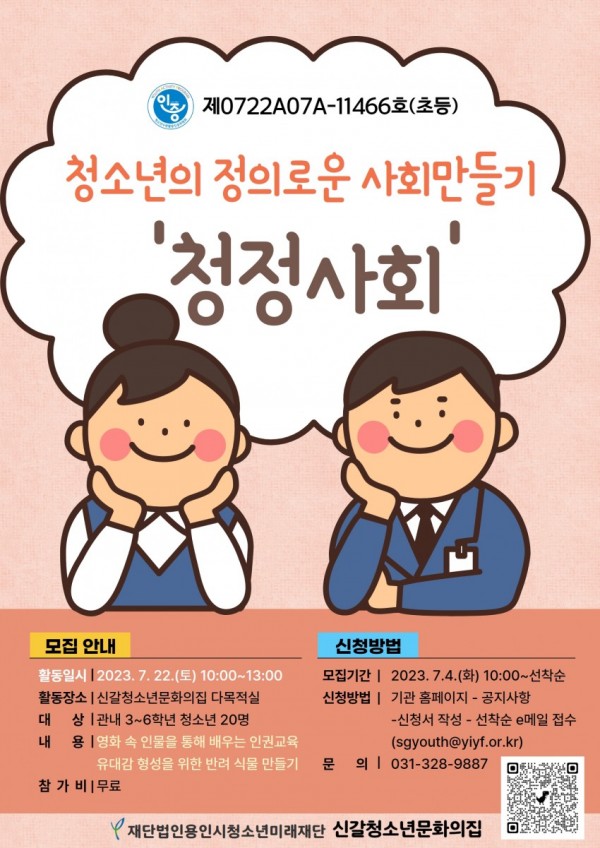 청소년의 정의로운 사회 만들기 ‘청정사회’1회차 활동 참가자 모집