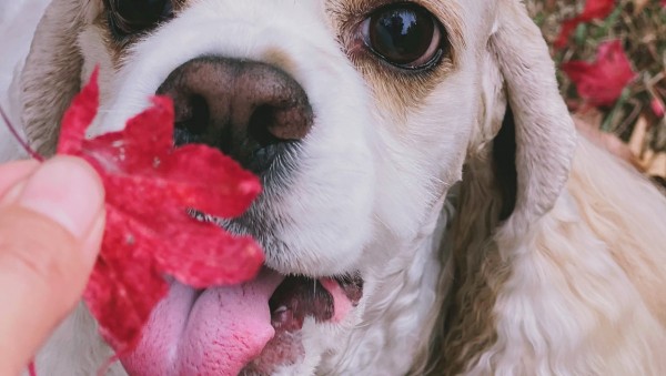 붉은 단풍낙옆과 강아지